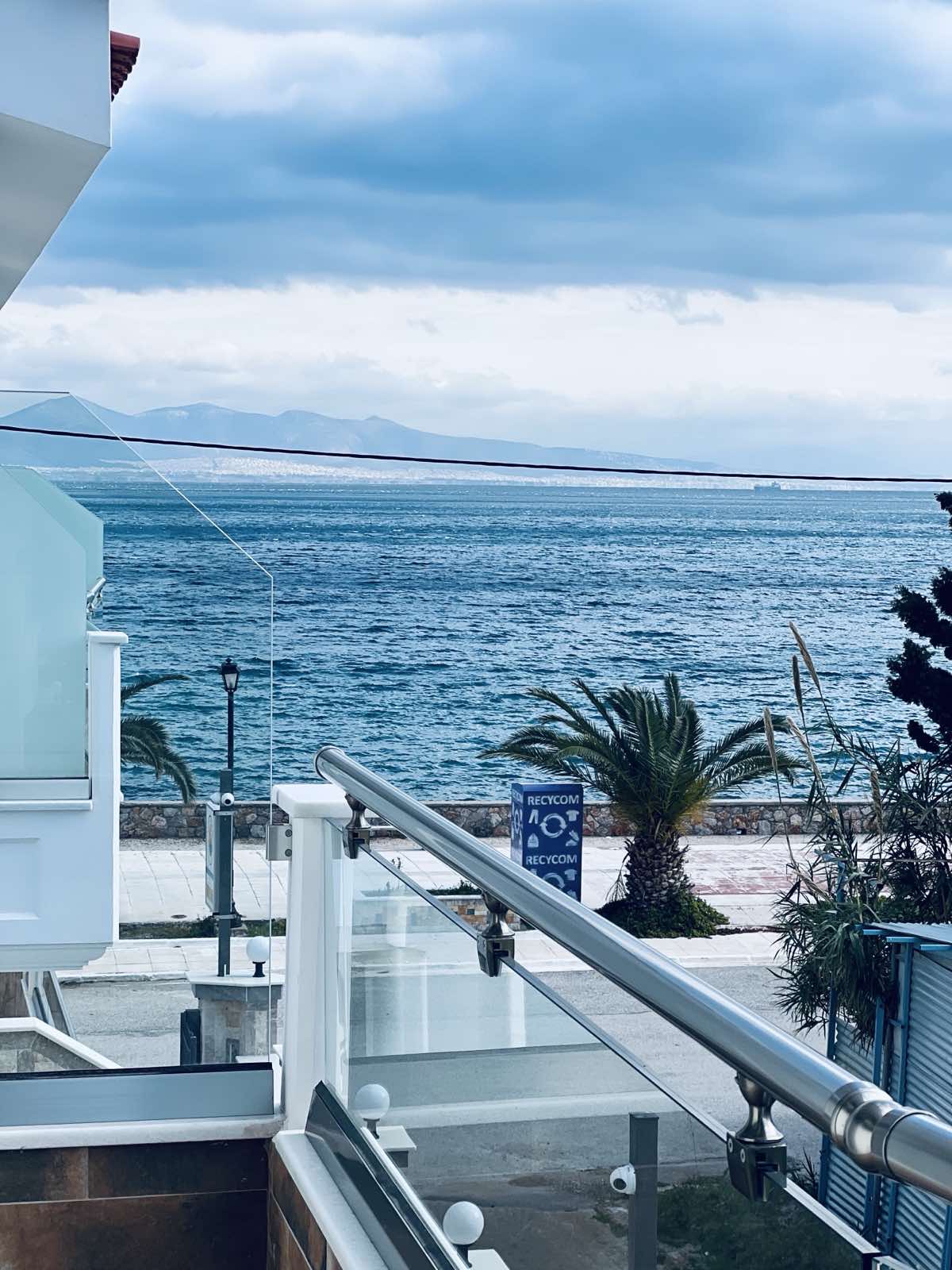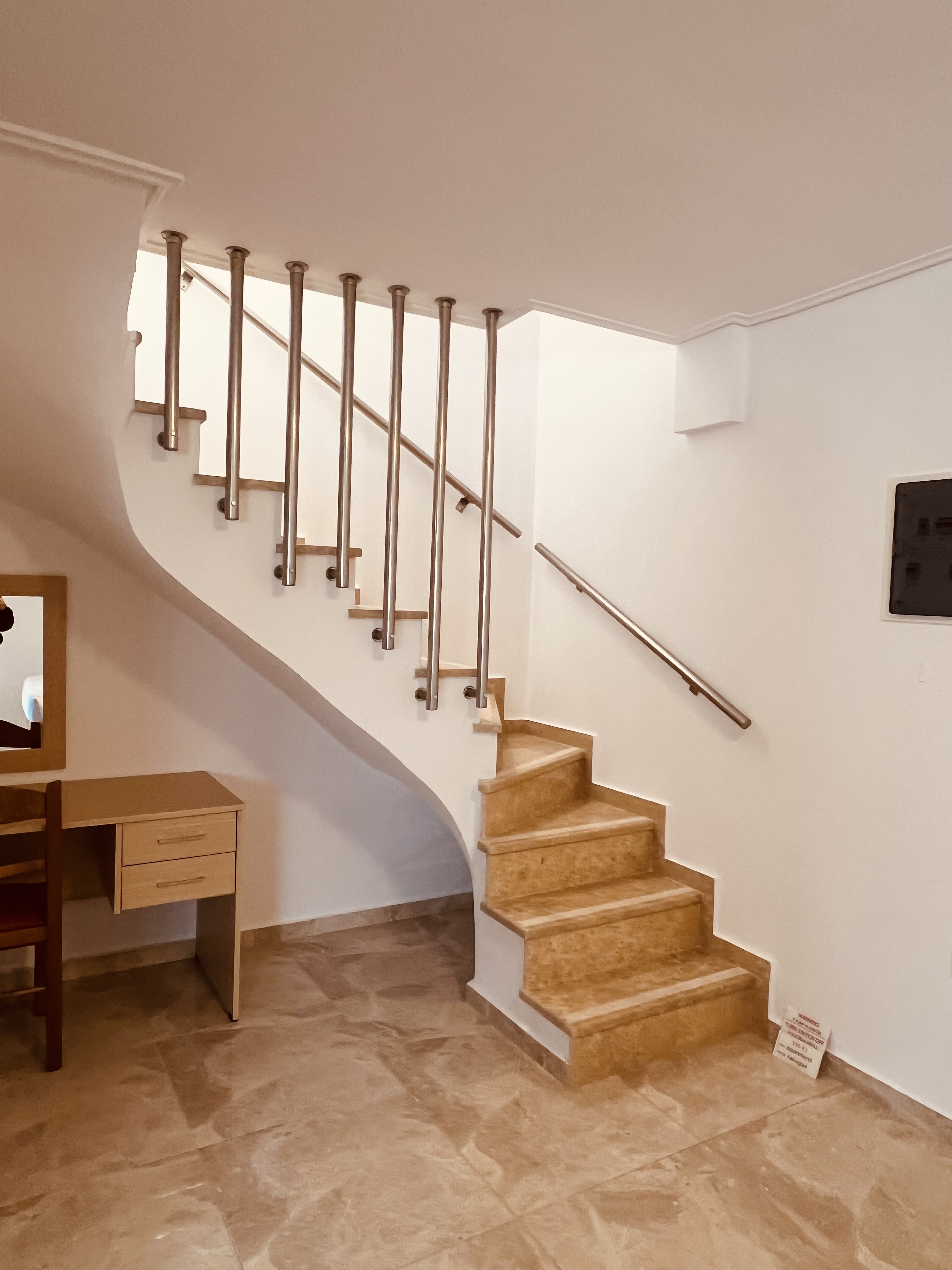 Entrance on the mezzanine floor consisting of a small terrace, dining room, sofa, TV, equipped kitchen, bathroom.